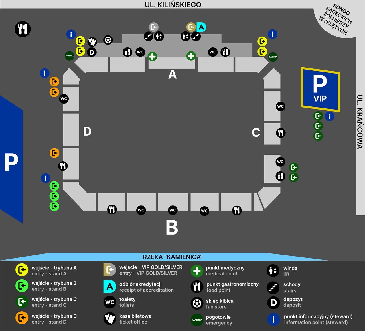 Wejście na stadion z wejściówką VIP znajduje się od strony ulicy Kilińskiego i jest odpowiednio oznakowane tablicami informacyjnymi.
