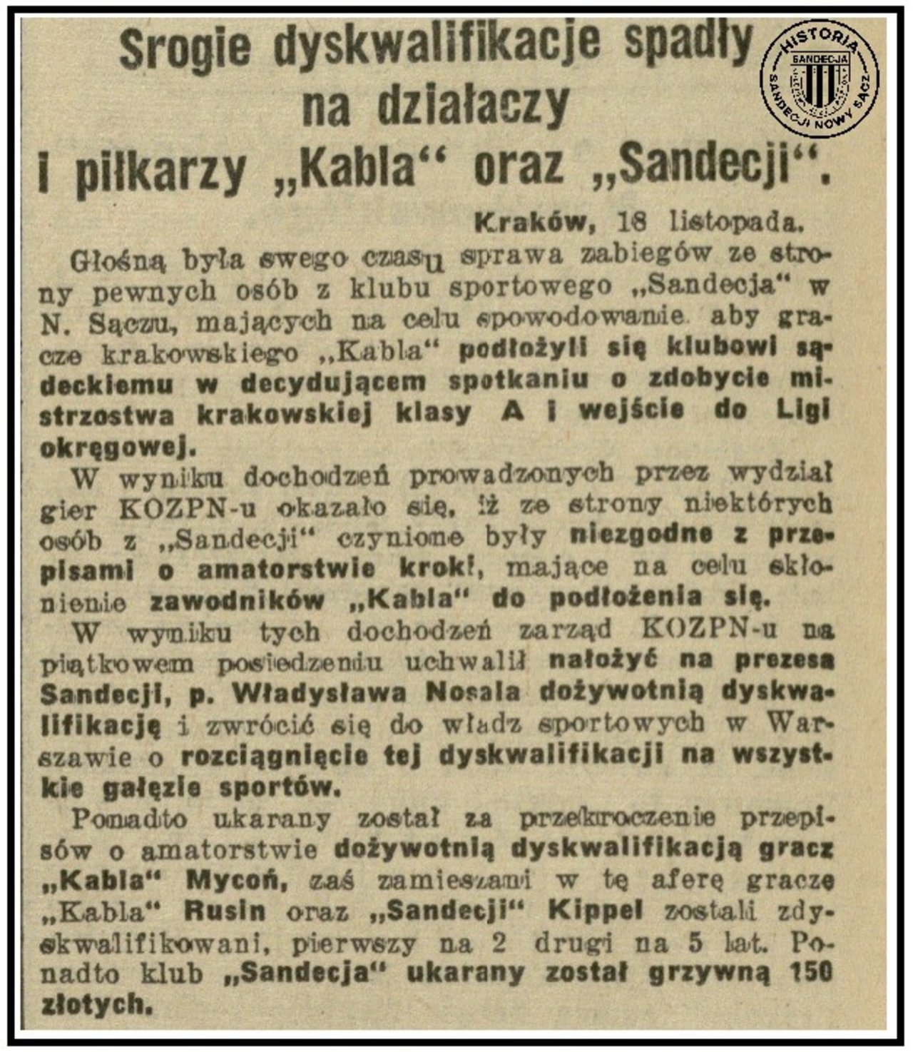 I rzeczywiście, drużyna „Kabla” przegrała z Mościcami, w dodatku pokonała w bezpośrednim meczu Sandecję, która złożyła protest przeciwko zespołowi z Mościc za „niedozwolone zdopingowanie drużyny Kabla”. Śledztwo Wydziału Dyscypliny KZOPN wykazało że to składający protest działacze „Sandecji” dopuścili się skorumpowania graczy krakowskiego „Kabla”, by ci wygrali swoje spotkanie z Mościcami. Dożywotnią dyskwalifikacją na działalność we wszystkich gałęziach sportu został ukarany członek zarządu „Sandecji” Pan Władysław Nosal, a Samuel Kippel w całej tej aferze był wymieniany jako jeden z głównych negocjatorów. Wydział Dyscypliny KOZPN skazał pomocnika „Sandecji” na pięcioletnią dyskwalifikację, którą w późniejszym czasie ostatecznie uchylono i powrócił do gry.